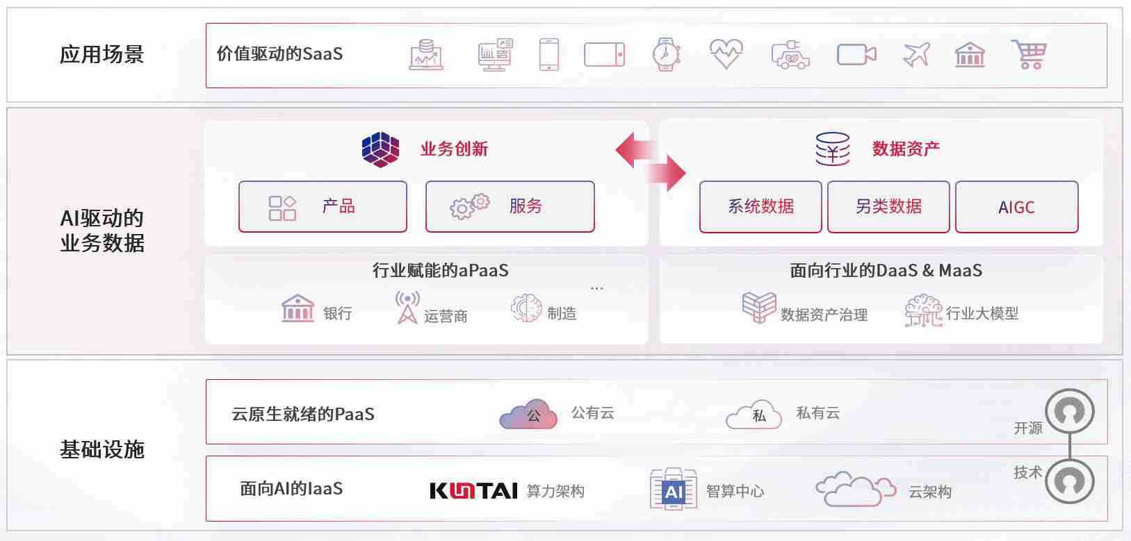 数字时代,,,,围绕企业数字化转型的关键要素,,糖心vlog数码开创性的提出数云融合战略和技术体系框架,,,着力在云原生、、、、数字原生、、、AI原生和信创产业上架构产品和服务能力,,,为处在不同数字化转型阶段的快消零售、、汽车、、、金融、、、医疗、、政企、、、教育、、、、运营商等行业客户提供泛在的敏捷IT能力和融合的数据驱动能力,,,,构建跨界融合创新的数字业务场景和新业务模式,,,,助力企业级客户建立面向未来的核心能力和竞争优势,,,全面推动社会的数字化、、智能化转型升级。。