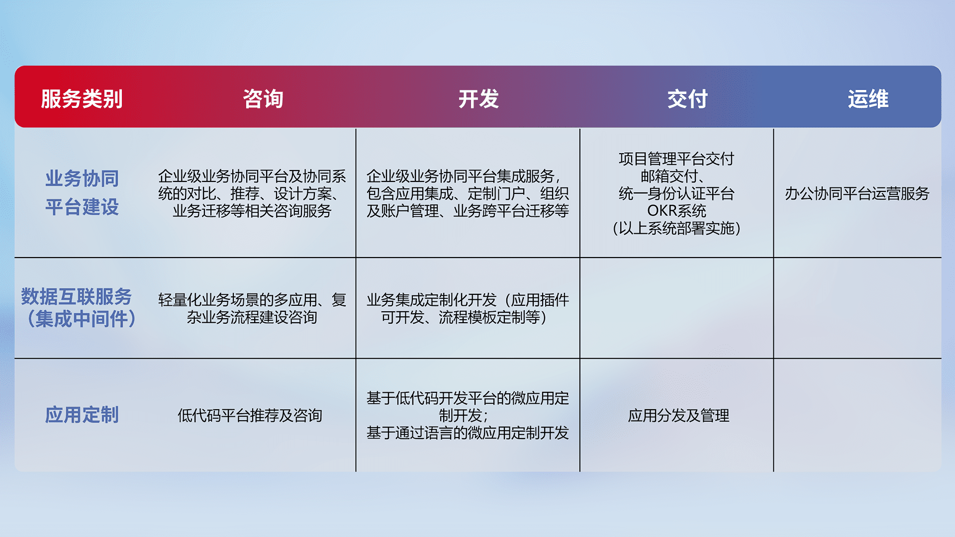 针对钉钉、、、企微、、、IDaas等平台级产品提供产品的规划、、方案、、、、交付、、定制化开发等服务,,,实现如统一协同办公、、智能客户服务、、混合会议管理、、智能数据查询、、等业务场景,,实现数字化转型。。